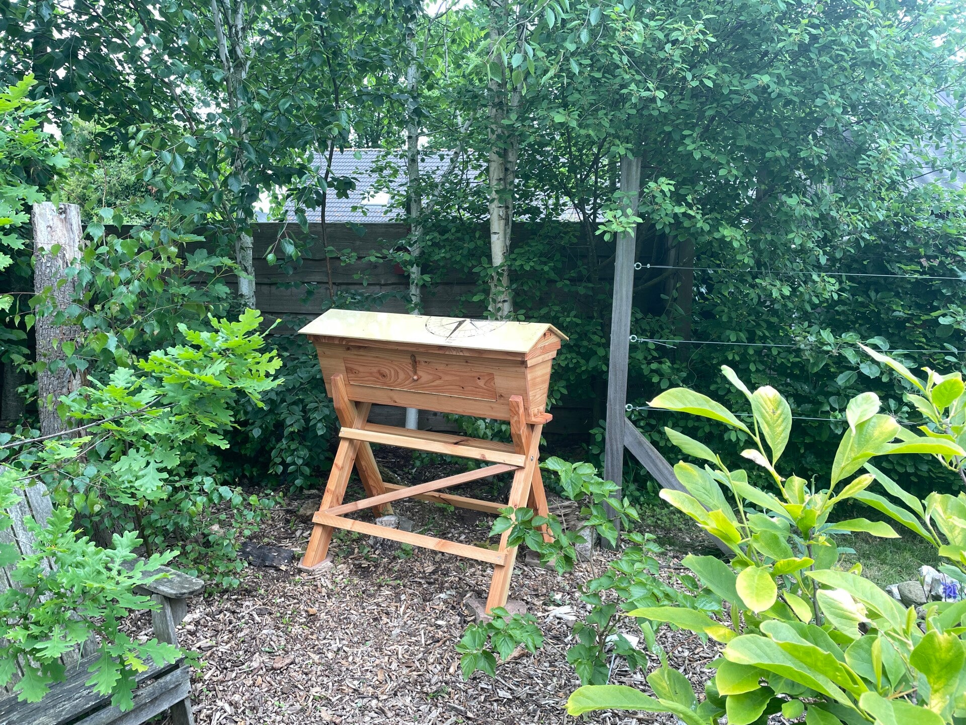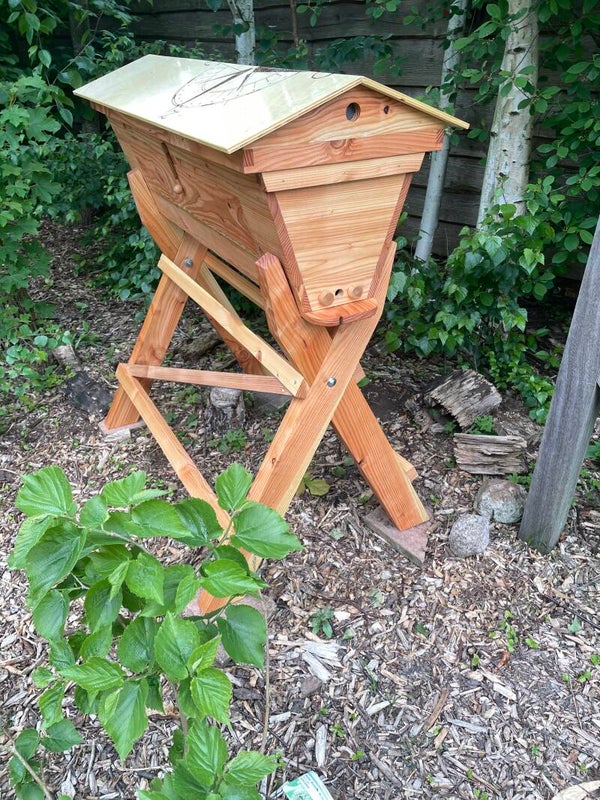 Deze Larixhouten Top-Bar-Hive heeft een plexiglas observatie raam. Is 110 cm lang en staat op een losse bok.