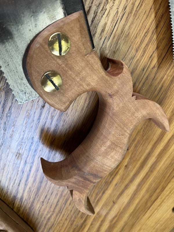 Uit de kringloop gehaalde handzagen, opgeknapt door de handvaten te vervangen en de zaagbladen te restaureren/slijpen.